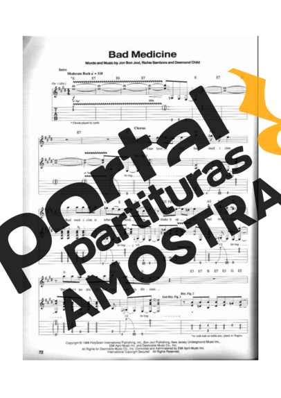 Partitura da música Bad Medicine de Bon Jovi transcrita especialmente para Guitarra em formato PDF.