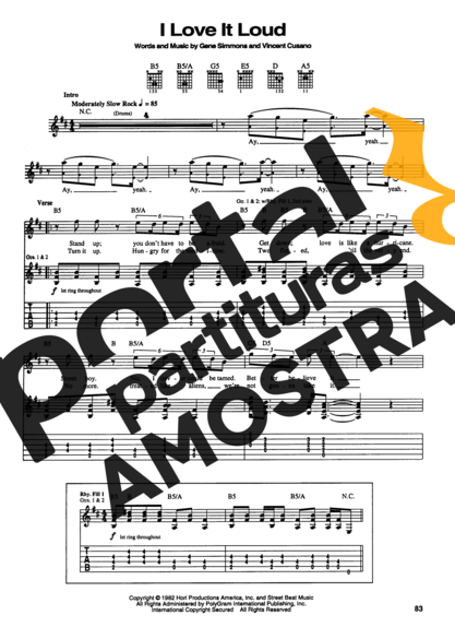 Partitura da música I Love It Loud de Kiss transcrita especialmente para Guitarra em formato PDF.
