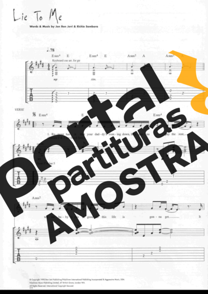 Partitura da música Lie To Me de Bon Jovi transcrita especialmente para Guitarra em formato PDF.