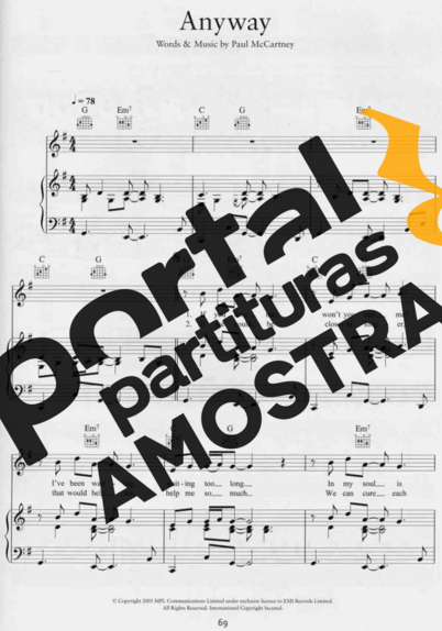 Partitura da música Anyway de Paul McCartney transcrita especialmente para Piano em formato PDF.