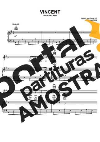 Partitura da música Vincent (Starry Starry Night) de Don McLean transcrita especialmente para Piano em formato PDF.