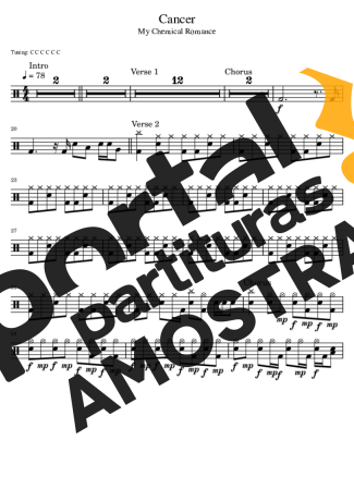 Partitura da música Cancer de My Chemical Romance transcrita especialmente para Bateria em formato PDF.