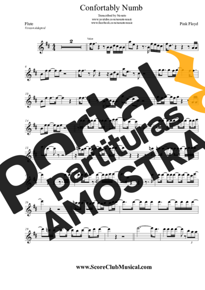 Partitura da música Comfortably Numb de Pink Floyd transcrita especialmente para Flauta Transversal em formato PDF.