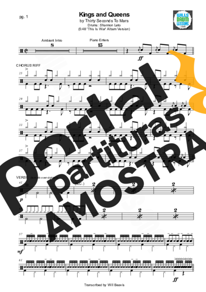 Partitura da música Kings and Queens de Thirty Seconds to Mars transcrita especialmente para Bateria em formato PDF.